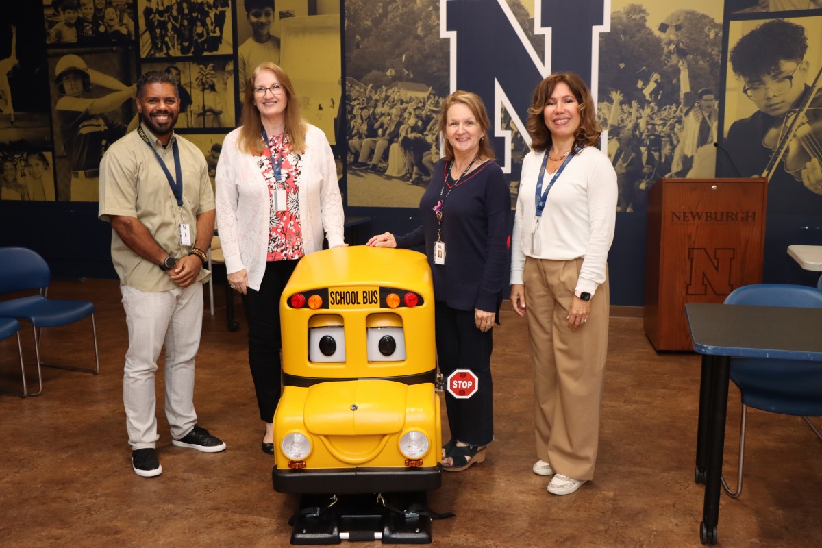 Our NECSD Transportation Department is pictured from left to right: Joel Quevedo, Patricia Coyne, Buster the training robot, Linda DiCocco, and Monica Solorzano.