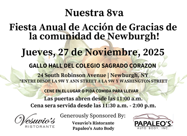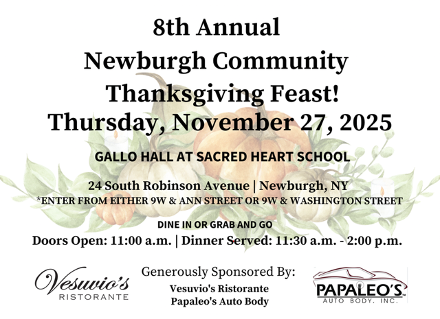 Gallo Hall Sacred heart thanksgiving meal: 11/27/2025 from 11AM-2PM. 24 South Robinson, Newburgh.