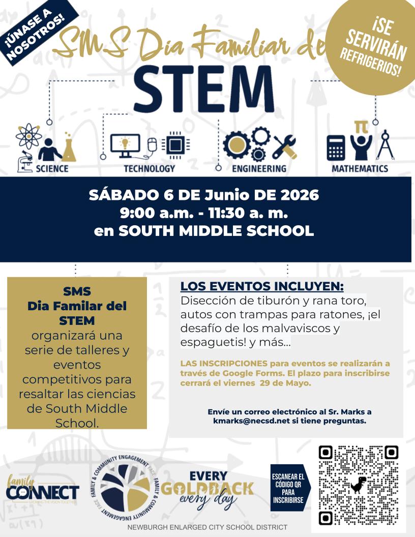 El DÍA FAMILIAR STEM de SMS organizará una serie de talleres y eventos competitivos para destacar la ciencia en South Middle School.