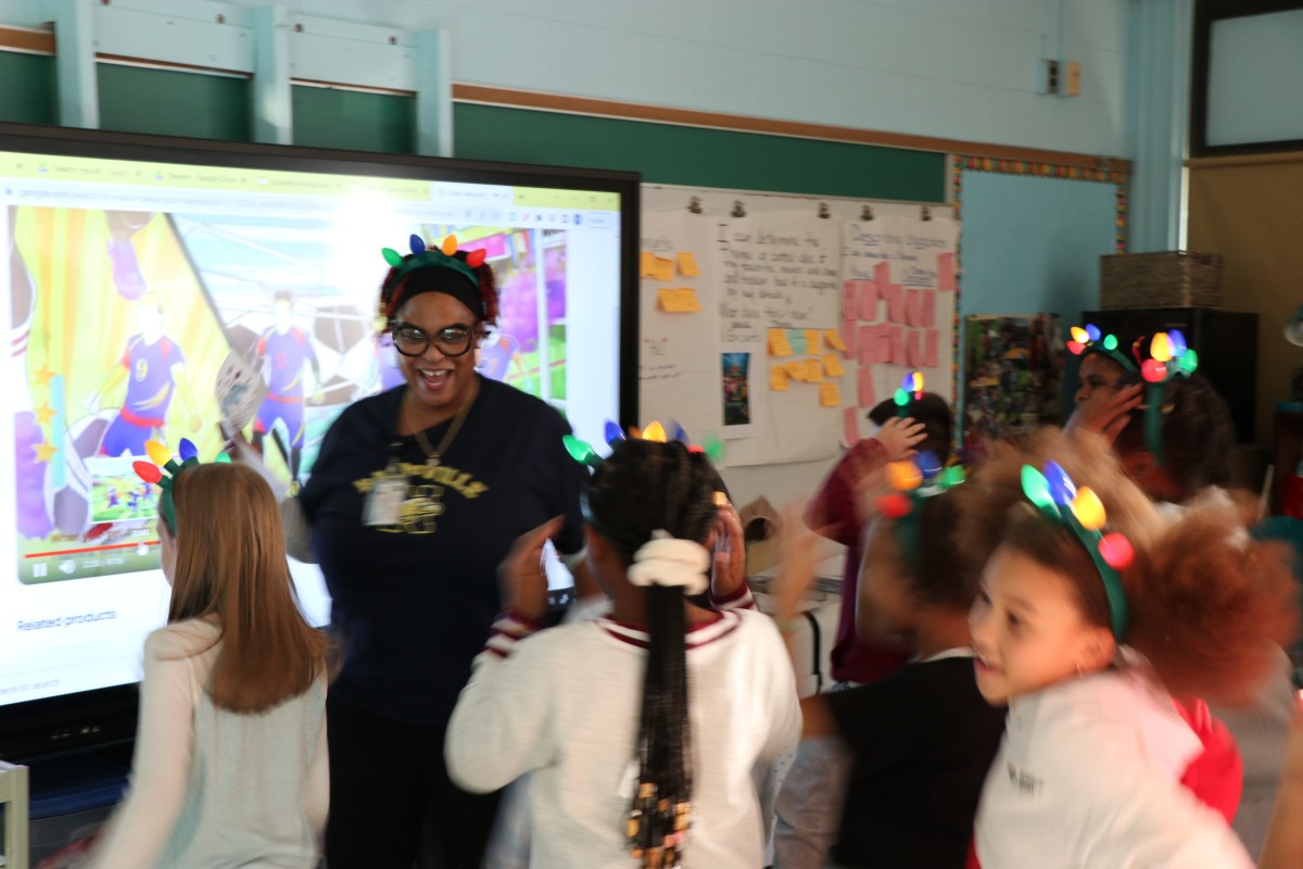 Scholars in Ms. Rayford's class are learning all about building positive relationships. As a class, they decided they wanted to honor someone they all hold near and dear to their hearts. The decision was easy for them as they selected School Nurse, Gretchen Quill, affectionately known as Nurse "G", as their "Class Auntie". Ms. Rayford's class walked down the hall to Nurse G's office and asked her if she would accept their nomination. When the students were asked why they chose Nurse G some of the answers were: "She always takes care of us." , "Even in our darkest moments she makes us smile.", "The colors she wears represent happiness.", and "She's a beautiful person." Ms. Rayford added, "Many people talk to children and say the things they think children need to hear, but Nurse G gives the children what they need with her actions. She shows them love daily". The children welcomed Nurse G to their classroom where they greeted her with a group hug. As a token of her appreciation, she presented them all with light-up holiday headbands. Nurse G spent a few moments with the class and their spirits were lifted as she spoke to each of them. She even took a few minutes to join them in their dance to Waka Waka (This Time for Africa). Before she left to go back to her office, the class took a moment to thank Nurse G for all she does and she thanked them for making her feel special and loved.