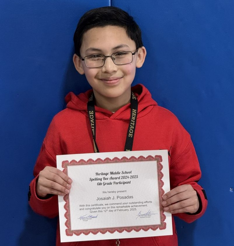 In a thrilling final round, Josaiah Posadas emerged as the champion of the Heritage Middle School Spelling Bee, securing victory with his exceptional spelling skills and composure under pressure.