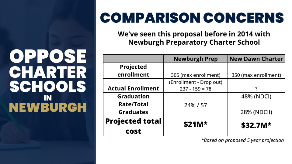 Community Opposition – Our Board of Education, local elected officials, national teachers’ associations, and many community partners have already expressed strong opposition. Families in Newburgh have made clear that they want to see our district programs strengthened, not destabilized. Our collective opposition is something we can all agree on.