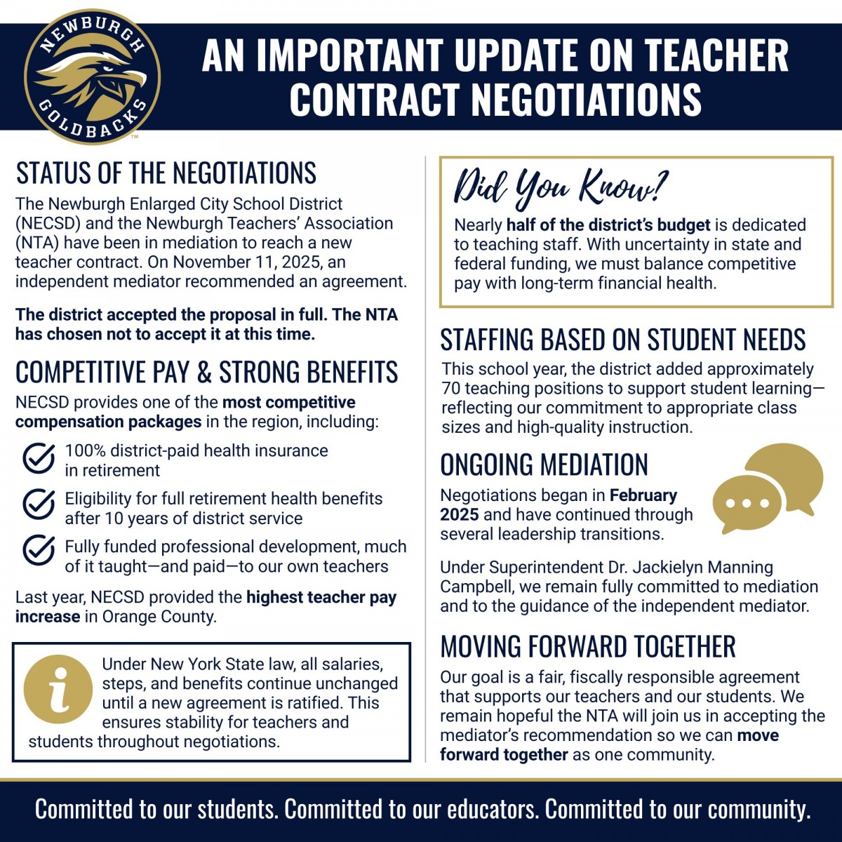 We are committed to maintaining open communication throughout the collective bargaining process with the Newburgh Teachers’ Association (NTA). This page serves as a hub for accurate, timely information about the negotiations and the steps we are taking to reach a fair and sustainable agreement.