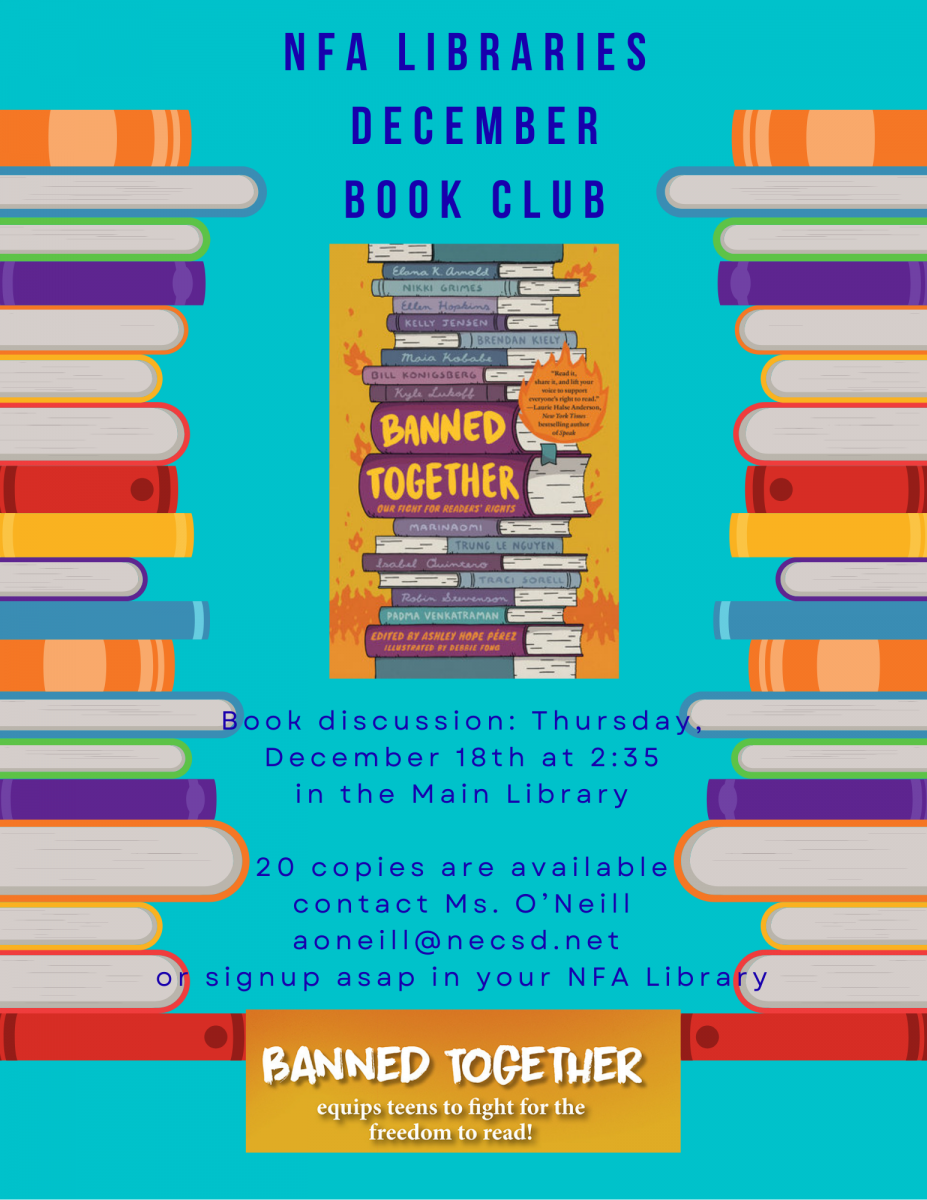 The NFA Book Club will be reading Banned Together by Ashley Hope Pérez as their December selection. The meeting to discuss the book is scheduled for December 18th.