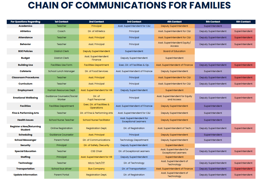The school district’s chain of communication outlines common topics and the appropriate levels for escalation for our families. Classroom-related matters, such as questions about assignments, grading, student progress, or minor behavioral concerns, should first be directed to the classroom teacher or relevant staff member. If the concern is not resolved, families may escalate school-based issues, including ongoing academic difficulties, attendance concerns, or student safety matters, to the school’s administration (such as the assistant principal or principal). District-level topics, including curriculum implementation, special services, transportation, or policy-related concerns, should be communicated to the appropriate district department or central office administrator. Concerns that remain unresolved or involve districtwide policy, compliance, or governance may be escalated to the superintendent’s office or, when appropriate, the school board, ensuring families have a clear, respectful, and transparent pathway for communication. For reference, the district’s chain of communications can be found on page 15 of our colorful wall calendar. [ See Chain of Communication]